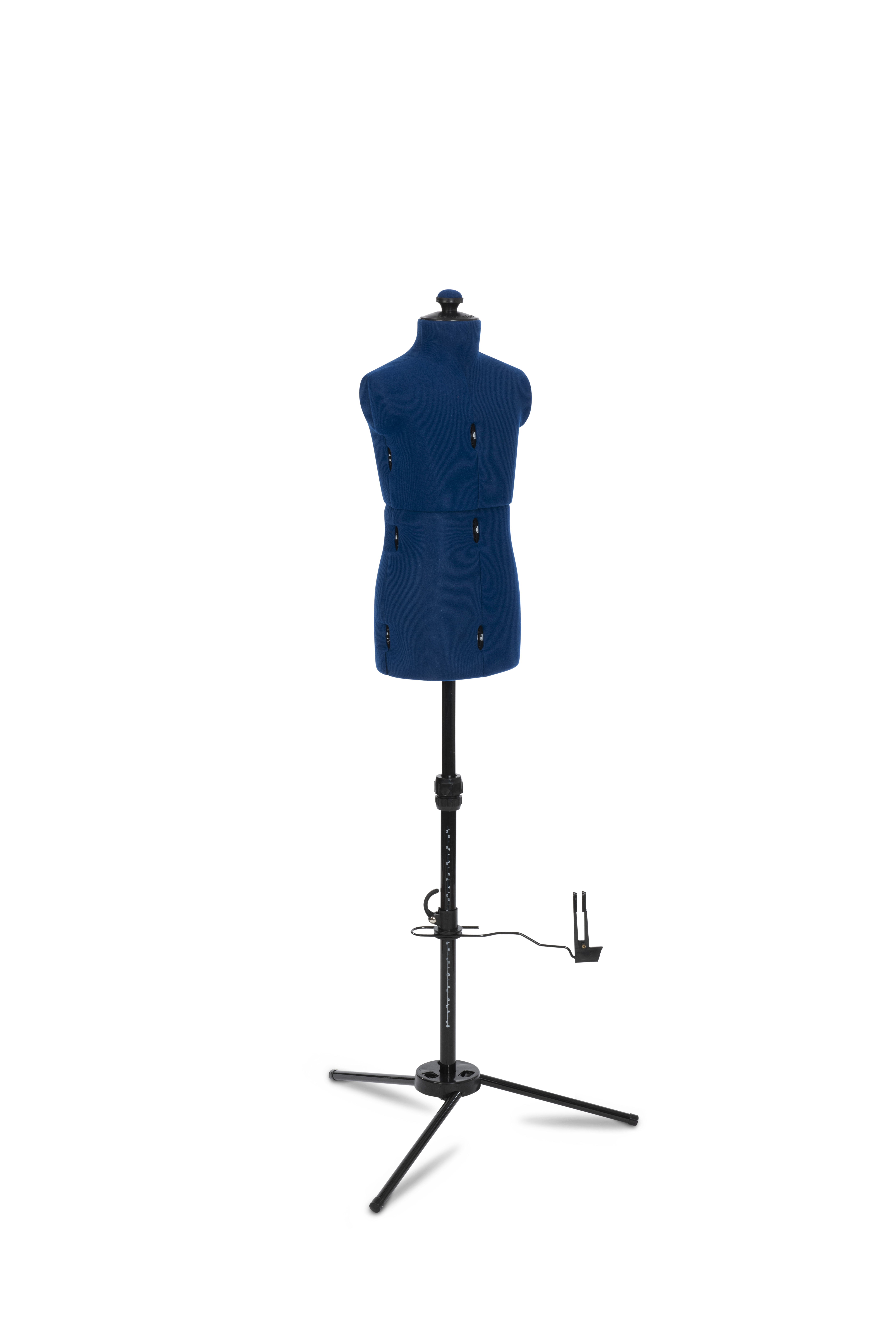 - The body is covered in a sapphire blue nylon fabric with a foam backing. This allows you to pin fabrics and patterns to the torso.